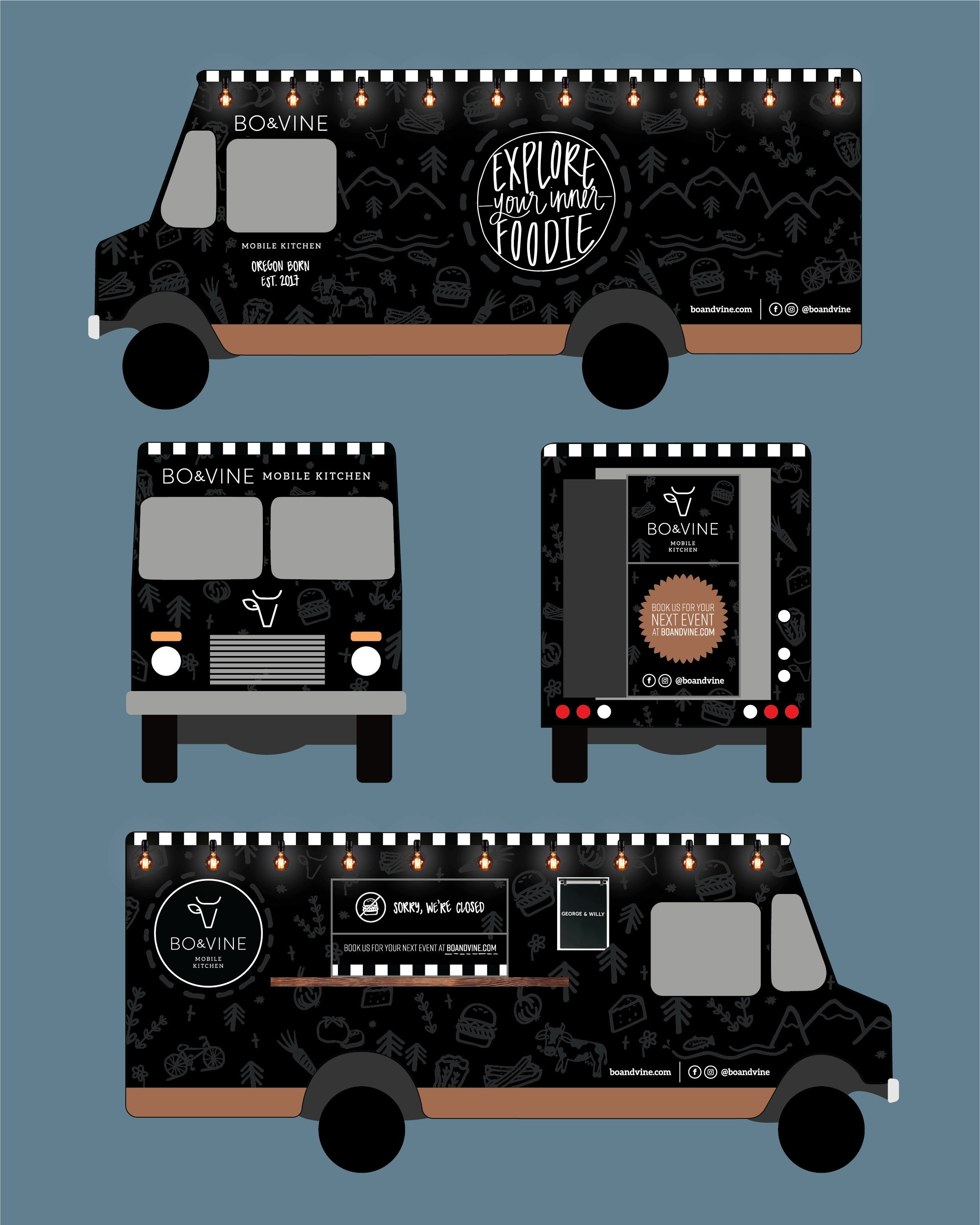 Since 2019, I’ve had the pleasure of working with the owners of Bo & Vine Burger Bar on a handful of projects, including a 9ft x 34ft in-restaurant mural, custom t-shirts, and a truck-wrap for their rad mobile kitchen.